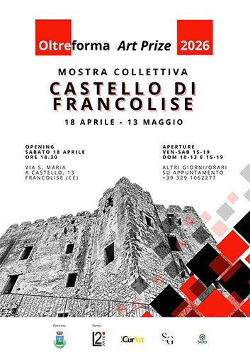 L’Associazione Oltreforma APS ha il piacere di presentare la mostra collettiva Oltreforma Art Prize che inaugura sabato 18 aprile 2026 presso il Castello Medievale di Francolise, in provincia di Caserta. L’iniziativa, patrocinata dal Comune di Francolise, ha come scopo il lavoro sul territorio attraverso la valorizzazione di luoghi simbolo della cultura e della storia, ed è volta a promuovere progetti artistici di pregio selezionati da una giuria che comprende critici dell’arte, docenti universitari, operatori dell’arte contemporanea, imprenditori e collezionisti.